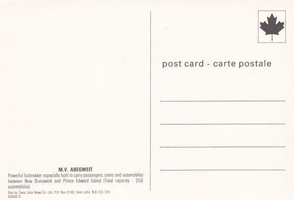 Ice-breaking train/vehicle/passenger ferry built at Saint John, New Brunswick, that entered service as Abegweit in 1982 between New Brunswick and Prince Edward Island. She was displaced in 1997 by the opening of the Confederation Bridge. Sold in 1999 and re-named Accrued Manager but never used. Sold again in 2004 and as Mariner was broken up at Alang, India.