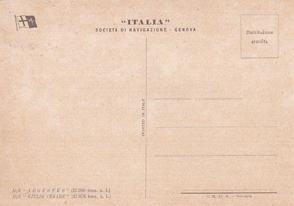 Made her maiden voyage as Augustus in 1952, Genoa to South America. From 1957 to 1961 she operated the New York service to replace the lost Andrea Doria. Withdrawn in 1976 then sold and renamed Great Sea but laid up in Hong Kong. In 1980 renamed Great King but remained laid up, and in 1982 moved to Manila and renamed Philippines, but still inactive, some use as an accommodation ship. Renamed President in 1985 and returned to Hong Kong. 1987 at Keelung and now called Asian Princess, reportedly refitted for cruising and in 1988 moved to Kaohsiung. By 1999 she was back in Manila and refitted for use as a floating hotel, renamed Philippines, again. Broken up at Alang in 2012.
