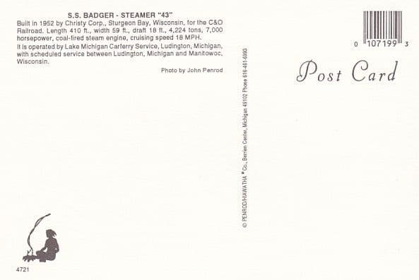 Coal-fired ferry built at Sturgeon Bay, Wisconsin, to carry railcars, passengers and vehicles. She entered service in March 1953 for the Chesapeake & Ohio Railway on Lake Michigan. Sold in 1983 to the Michigan-Wisconsin Transportation Company, same service. Laid up in 1990 and purchased the following year by Charles F. Conrad, for Lake Michigan Car Ferry Service, she underwent a major refit including the removal of the railcar capability. She now operates between Ludington, Michigan, and Manitowoc, Wisconsin, from May to October, still coal-fired and designated in the USA as a National Historic Landmark.