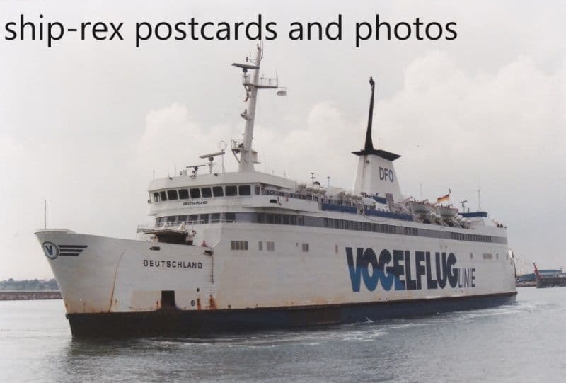 Train ferry built in 1972 at Rendsburg, Germany, as Deutschland for the German State Railway service from Puttgarden to Rodby. From 1991 she was sailing for DFO (Deutsche Fährverkehrsgesellschaft Ostsee). In 1998 she was sold to El Salam Shipping of Suez and renamed El Salam 97. After delivery to Port Said she suffered a major mechanical breakdown and in 1999 was sold for breaking up at Alang, India.