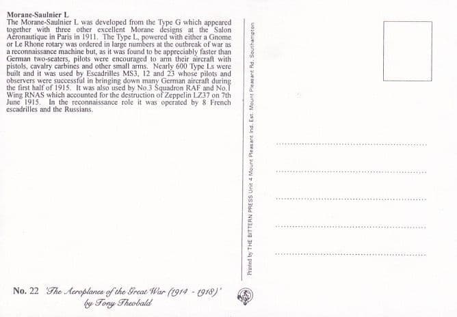 postcard, "The aeroplanes of the Great War (1914-1918) by Tony Theobold" no. 22