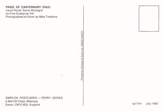 Passenger and vehicle ferry built at Alblasserdam, Netherlands, that entered service in 1974 for Townsend-Thoresen as Free Enterprise VIII, Dover-Zeebrugge. When the company became P&O European Ferries in 1987 she was renamed Pride Of Canterbury and placed on the Dover-Boulogne route. When the Boulogne route was closed in 1993 she was sold to GA Ferries and renamed Romilda, principally being employed between Piraeus and the Greek Islands. Broken up at Aliaga in 2011.