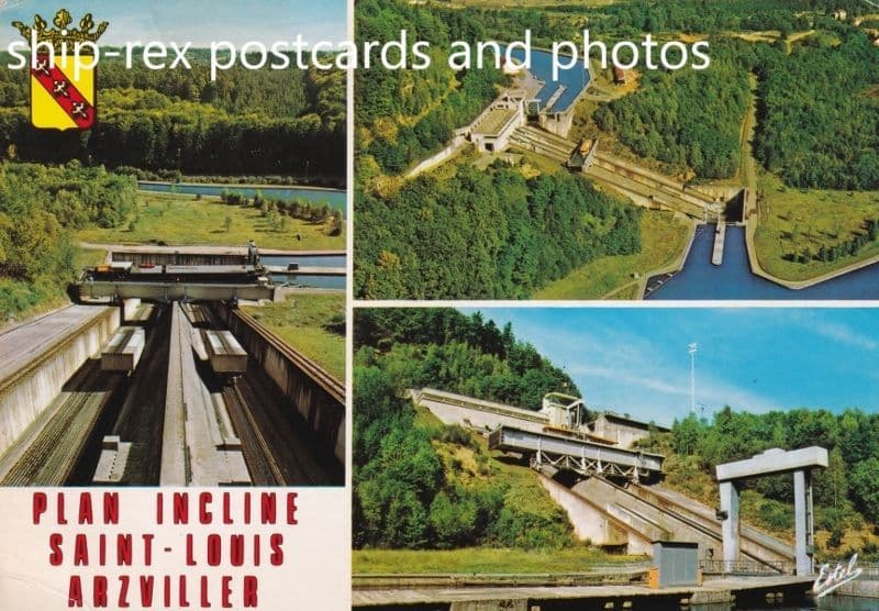 this barge elevator enables the Marne-Rhine Canal to traverse the Vosges Mountains and opened 1/1969.