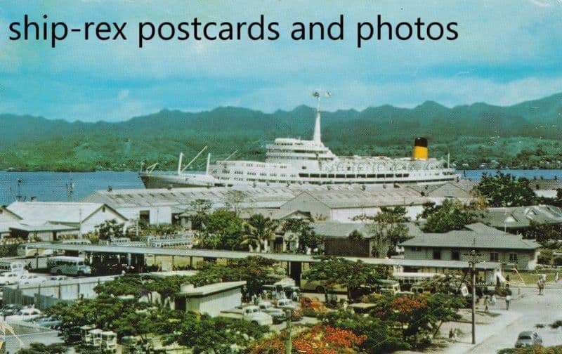 Built by Harland & Wolff and launched by HM The Queen as Southern Cross, she entered service on Shaw Savill round the world service in 1955. In 1971 she was laid up, first in Southampton, then on the River Fal. Sold in 1973 to Ulysses Lines and renamed Calypso. She started cruising in 1975 first chartered to Hapag-Lloyd and then Thomson Holidays. In 1980 she was briefly called Calypso 1 before she went to Eastern Steamship Lines and was renamed Azure Seas. In 1982 her owners were Western Steamship Lines but she had the same name. Sold in 1991 to Dolphin Cruise Line she was renamed Ocean Breeze. In service until 2003 when she was broken up in Bangladesh.