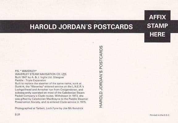 The last sea-going, passenger-carrying paddle-steamer in the world. She was built in 1946 for the Clyde services of LNER, being transferred to the Caledonian Steam Packet in 1948. She was withdrawn in 1973 and sold to the Paddle Steamer Preservation Society for a nominal fee (£1). She was then renovated as an excursion vessel operated by Waverley Excursions around the coasts of Britain.